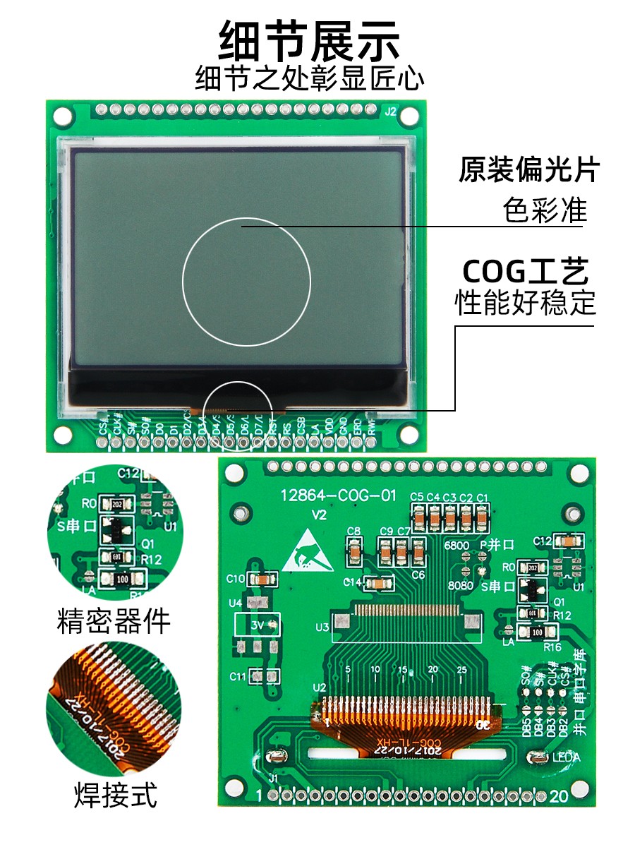 C0G:将驱动芯片(例如 ST765)、FPC 软板(例如金手指)直接压贴在玻璃上的封装形式叫做 COG,有性价比高,低功耗,体积小,软件指令丰富的优势工作电压3.3V,背光电压3.3V60MA,可做5V,采购时请和业务说明电压通讯方式:8位并行(6800和8080时序),4线串行通讯,采购时请和业务说明迅方式
