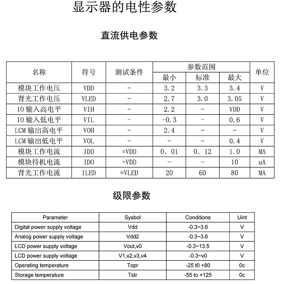工作电压3.3V,背光AK3V