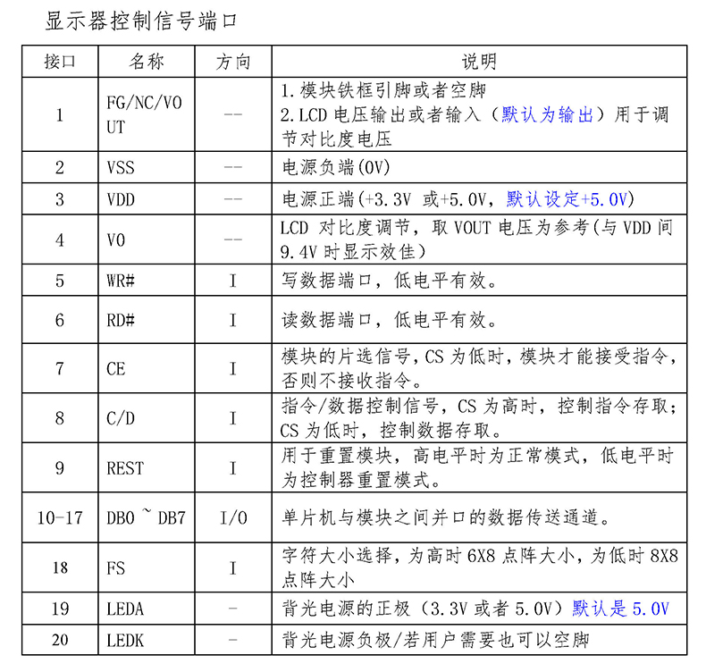 提供供与MPU通讯方式:8位并行8080时序硬件初始化,完成大部份初始化工作,用户更多时间花在软件编写上128字型ROW(OGROM),ASCII日文,英文,数据,(默认芙文)