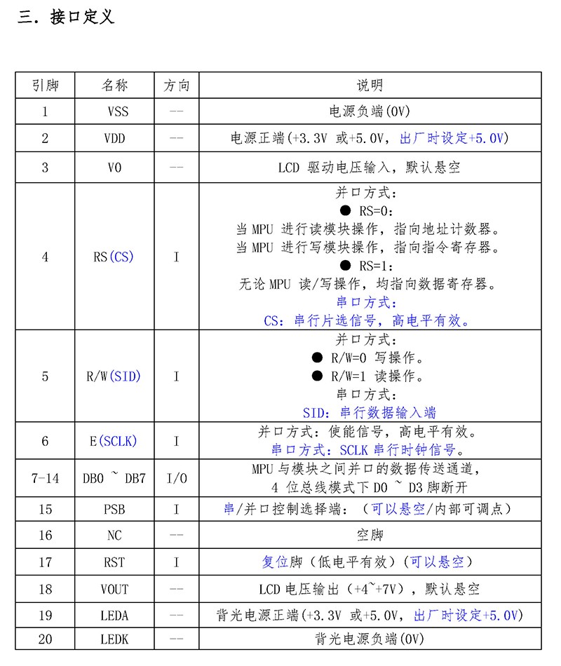 提供三种与 MPU 通讯方式:4位、8位并行,串行通讯(默认出厂未固定用户自己控制 PSB 来选择)48x16bit的字符显示RAM(LCD最多显示汉字为2行x8字)64x128bit的绘图RAM(GDRAM)